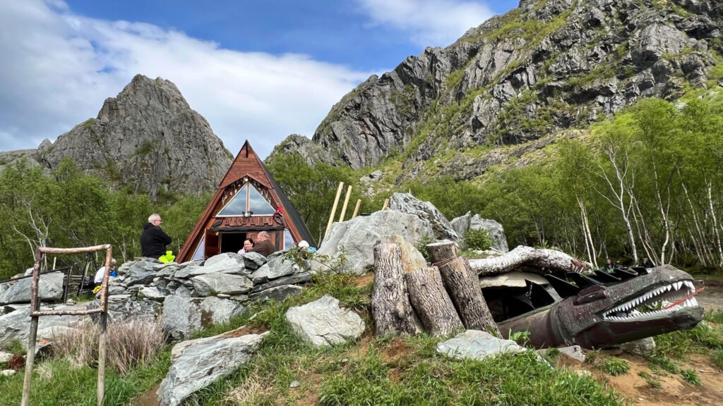 – Det begynte med en hytte i 2018. Egentlig skulle vi bygge flere, jeg hadde hele tiden lyst til å sette opp et lokale som står i stil med naturen. Det er mye vikingehistorie rundt her, og lokalene måtte passe med historien og naturen. I tillegg har fokuset mitt vært på gjenbruk. Siden jeg alltid har holdt på med mat, så ville jeg sette opp et lokale hvor jeg også kunne drive med servering, utdyper hun, mens hun serverer kundene inne i serveringsstedet Dragereiret urtesuppe og kaker.