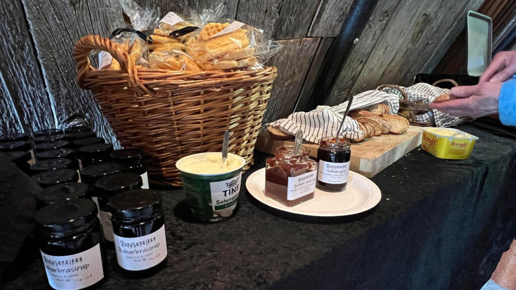 – Jeg har ikke strøm og kjøkken her oppe, så selve Dragereiret blir drevet av et aggregat og kjøkkenet blir drevet nede på gården min rett over veien. All maten tas oppover hit. Alt er hjemmelaget fra bunn, og helst bruker jeg råvarer fra nærområdet. I en verden hvor det er så mye som er falskt, så setter folk pris på å få servert ekte mat. Det betyr noe for folk, forteller Fjellsøy med et smil, mens hun serverer hjemmelaget brød med rabarbrasyltetøy og solbærsyltetøy, og saft fra heggblomst og geitrams – alt fra egen kjøkkenhage.