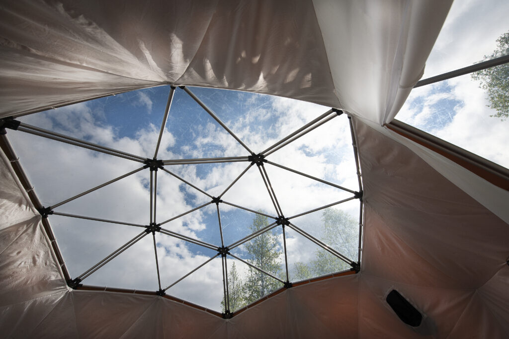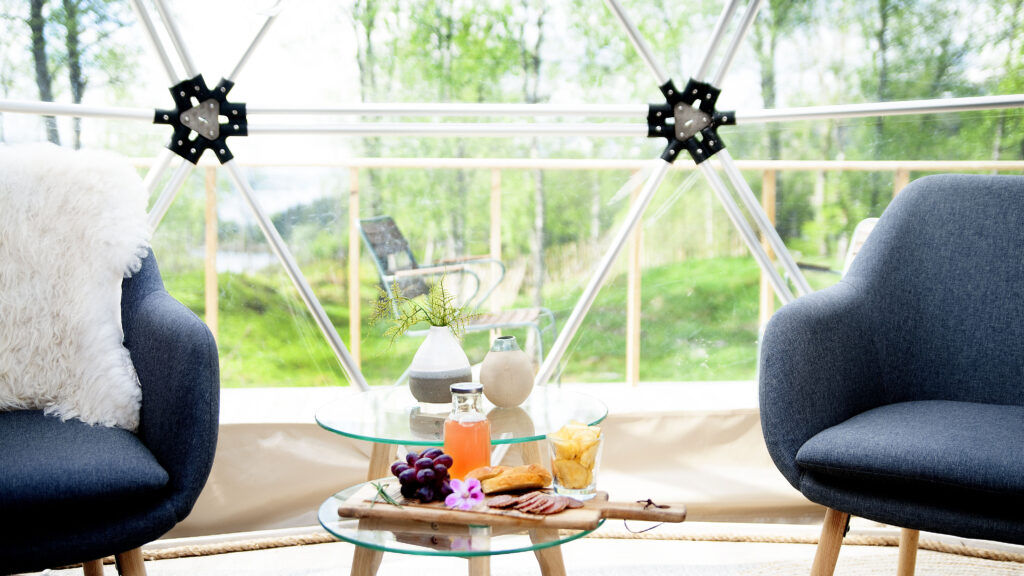 Inne i teltboblene møter du ei lekkert oppredd dobbeltseng med innbydende madrasser, moderne sittemøbler og bord, og utsikt både utover og oppover. Teltene har nemlig gjennomsiktig tak. Med muligheten til elektrisk oppvarming i tillegg, har virkelig tradisjonell camping glidd over til det langt mer elegante og fristende glamping: Glamorøs camping.