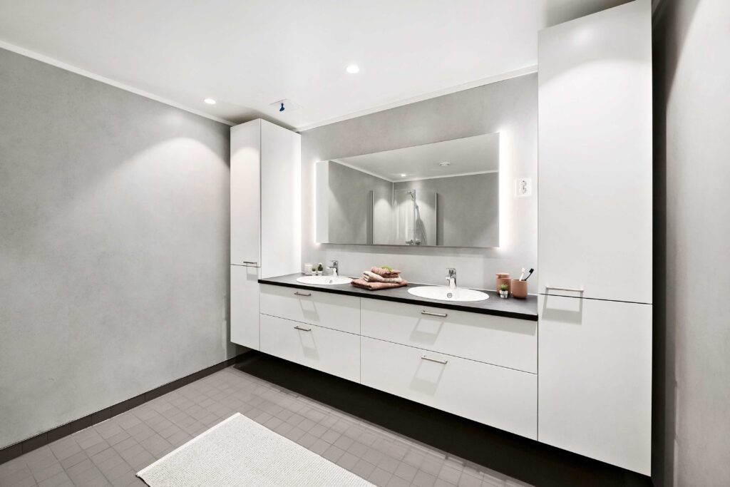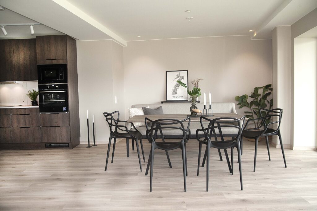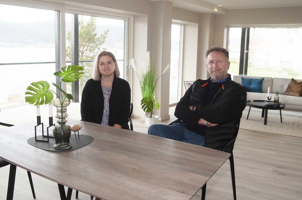 Det som møter oss inne er varme farger, store vinduer som slipper inn godt med lys, en flott utsikt over Ranfjorden og lekre innredninger på kjøkken og bad. Alle badene er god i størrelse, og de fleste har dobbel vask.